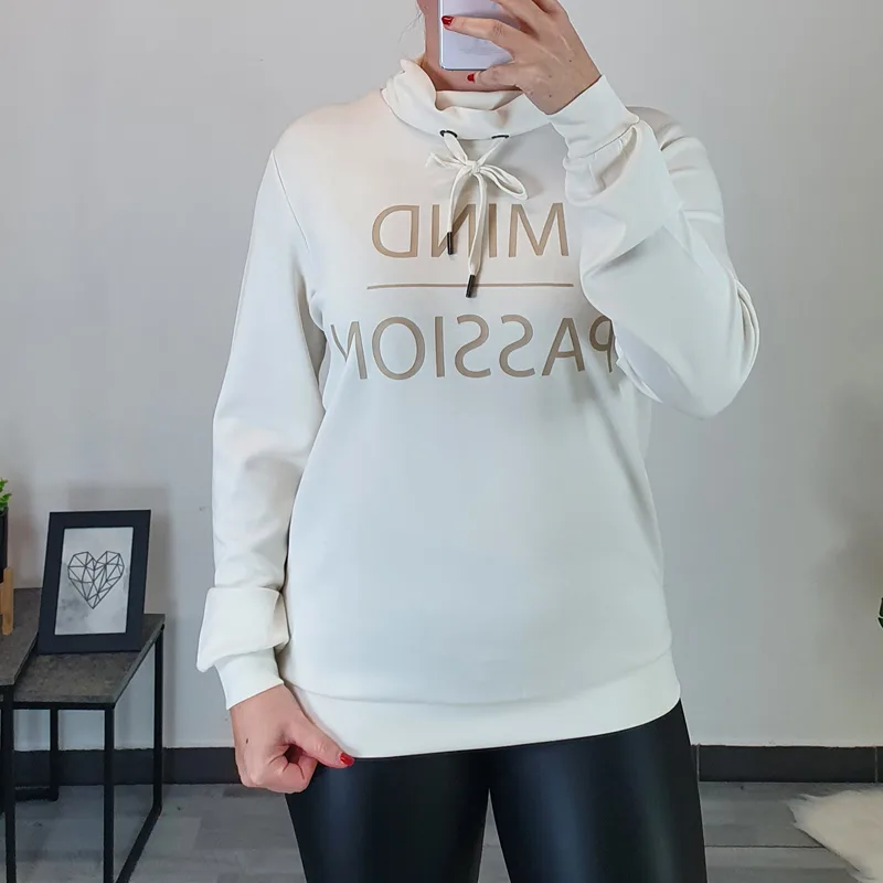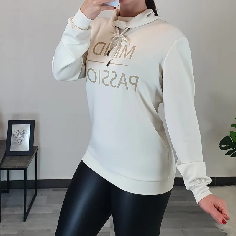 Modna ženska majica Banu v bež barvi. Majica ima dolga rokava ki se zaključujejo s patentom. Ima visok ovratnik brez kapuce. Na sprednji strani ima dodan napis MIND/PASSION. Izdelana je iz mešanice modala in je zelo mehka na otip.