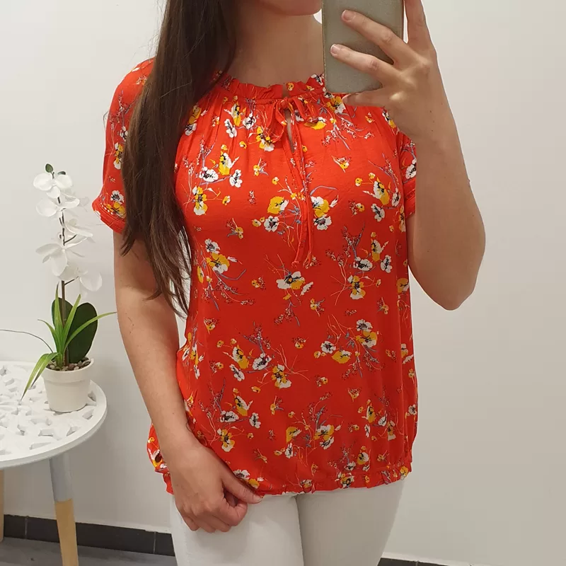 Majica Belici s kratkimi rokavi. Majica je v rdeči barvi s cvetličnim vzorcem.