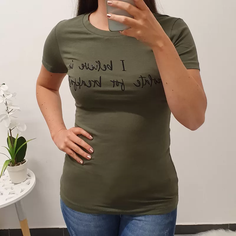 Majice Believe s kratkimi rokavi. Majica je v olivno zeleni barvi s tiskom.
