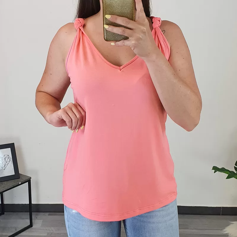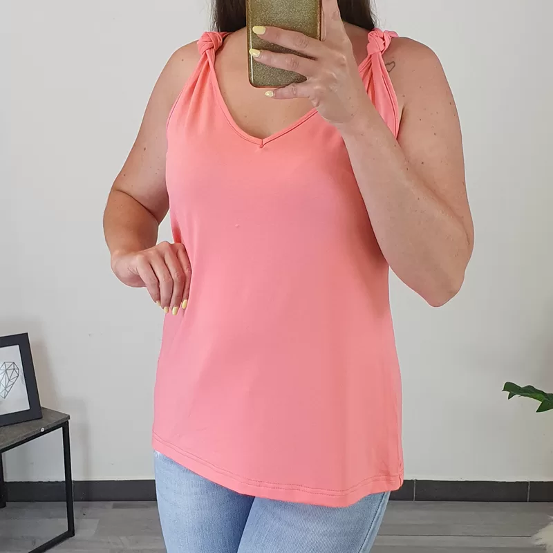 Ženka viskozna majica Pina z ozkimi naramnicami v losos barvi. Majica je izdelana iz kvalitetne viskoze in je prijetna za nošenje. Kroj majice je rahlo v obliki črke “A” in lepo pade ob telesu. Na naramnici ima narejen vozel, kar ji daje posebno zanimiv izgled. Majico boste odlično kombinirale k vašim poletnim oblačilom. Na voljo je od številke 38 do 50.