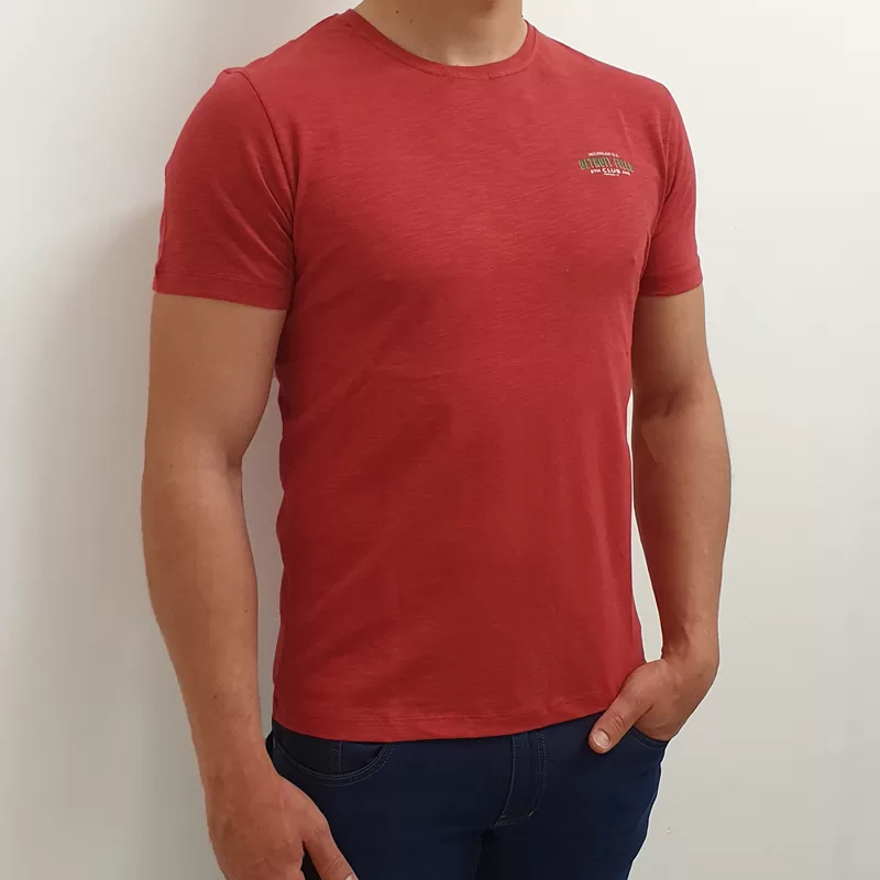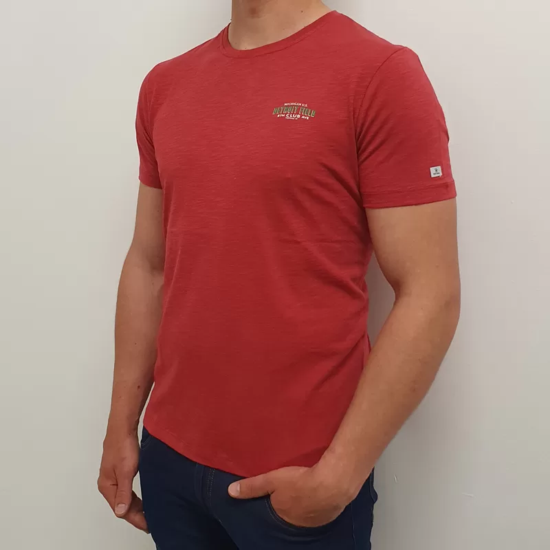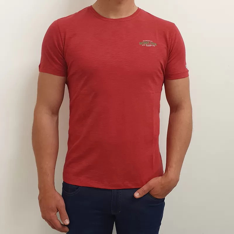 Moška majica Detroit  s kratkimi rokavi. Majica je v rdeči barvi, na levi strani ima manjši napis.