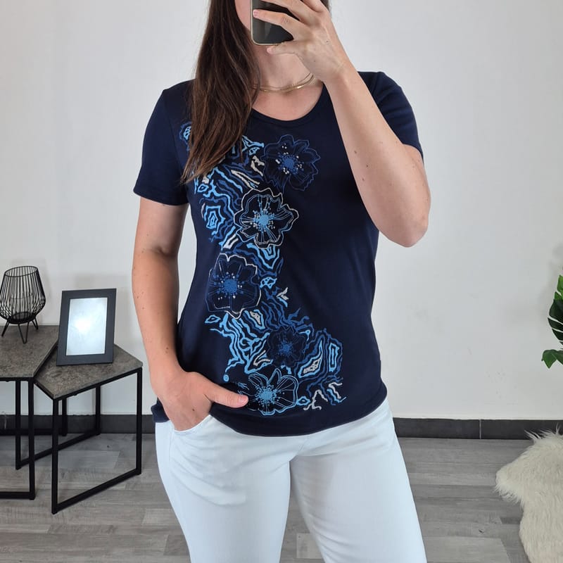 Modna ženska majica s kratkimi rokavi. Majica je temno modre barve, na sprednji strani jo krasi tisk v srebrni in modri barvi. Izdelana je iz 100% bombaža in je prijetna za nošenje. Na voljo je od številke M do XXL.