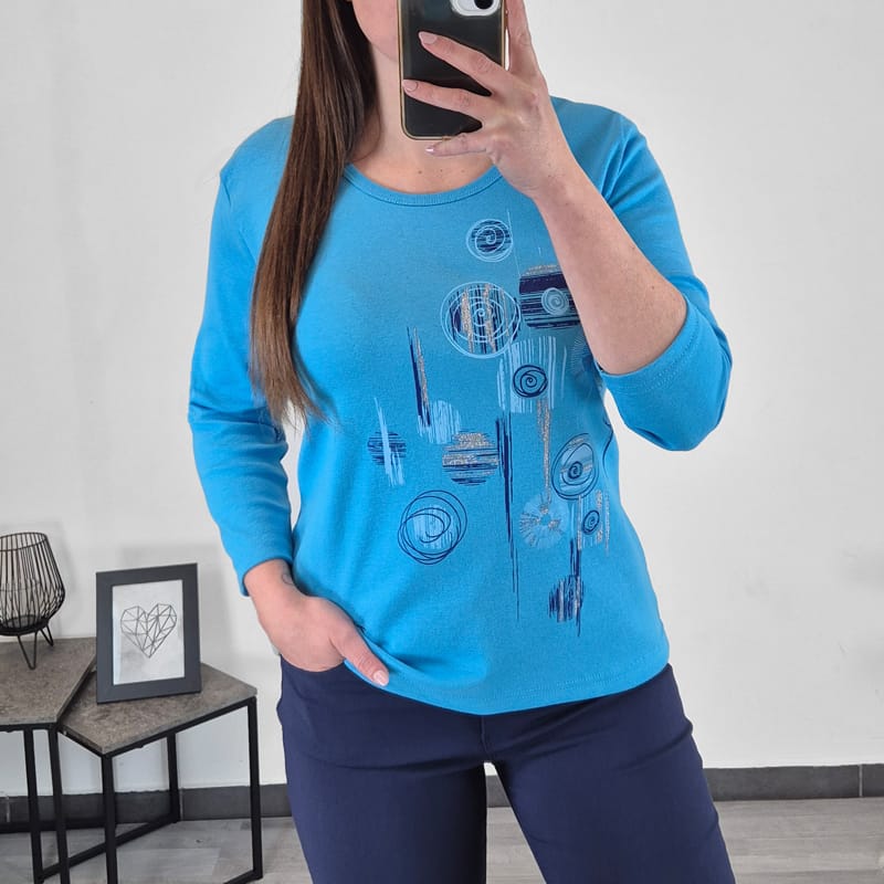 Ženska majica s 3/4 rokavi. Majica je izdelana iz kakovostnega bombaža in je elastična. Majica je v modri barvi, na sprednji strani je dodan tisk v odtenkih modre in srebrne barve.