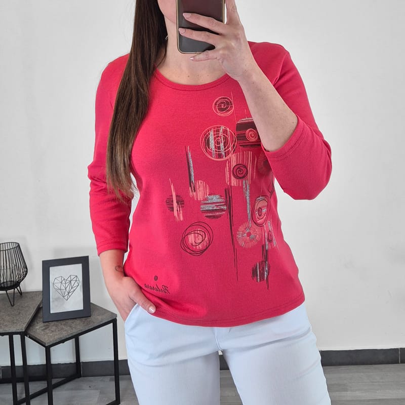 Ženska majica s 3/4 rokavi. Majica je izdelana iz kakovostnega bombaža in je elastična. Majica je v roza barvi, na sprednji strani je dodan tisk srebrne barve.