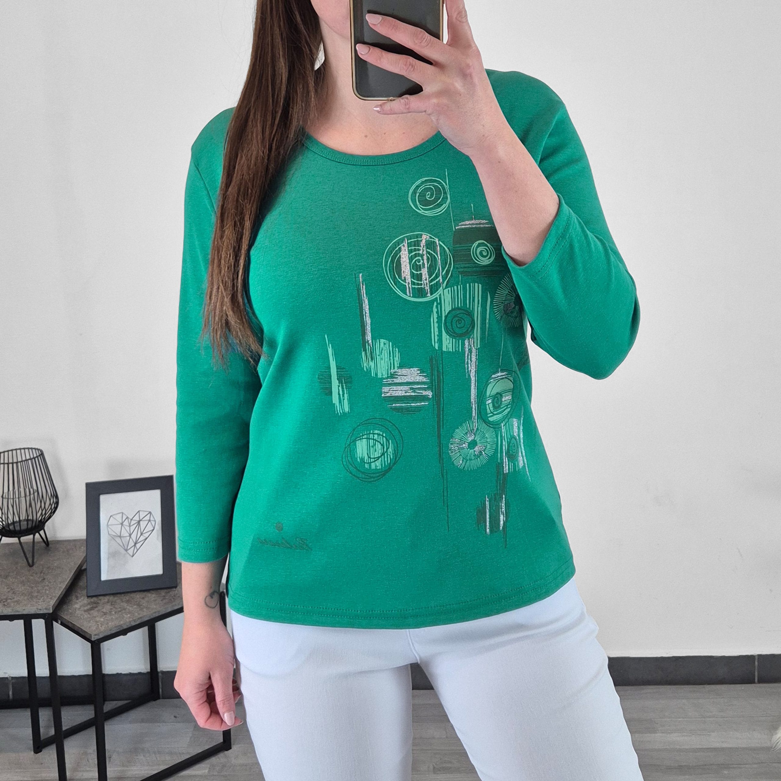 Ženska majica s 3/4 rokavi. Majica je izdelana iz kakovostnega bombaža in je elastična. Majica je v zeleni barvi, na sprednji strani je dodan tisk v odtenkih zelene in srebrne barve.
