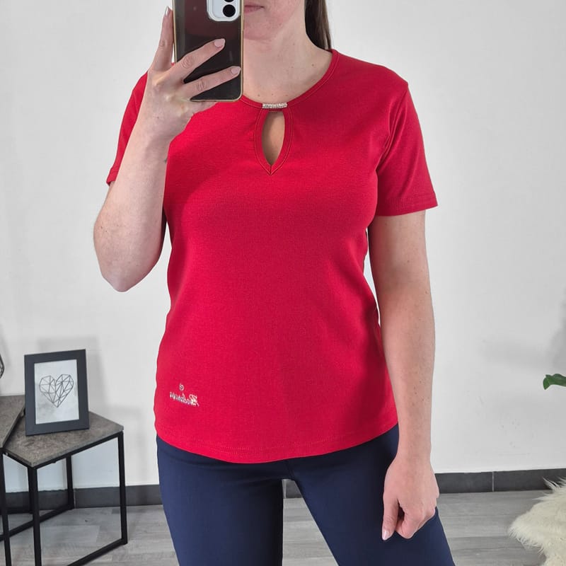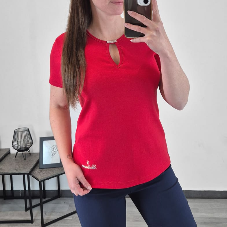 Ženska majica s kratkimi rokavi. Majica je izdelana iz kakovostnega bombaža in je elastična. Majica je v rdeči barvi. Ima okrogli ovratnik, ki ga krasijo bleščice.