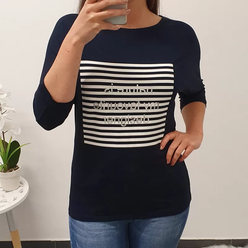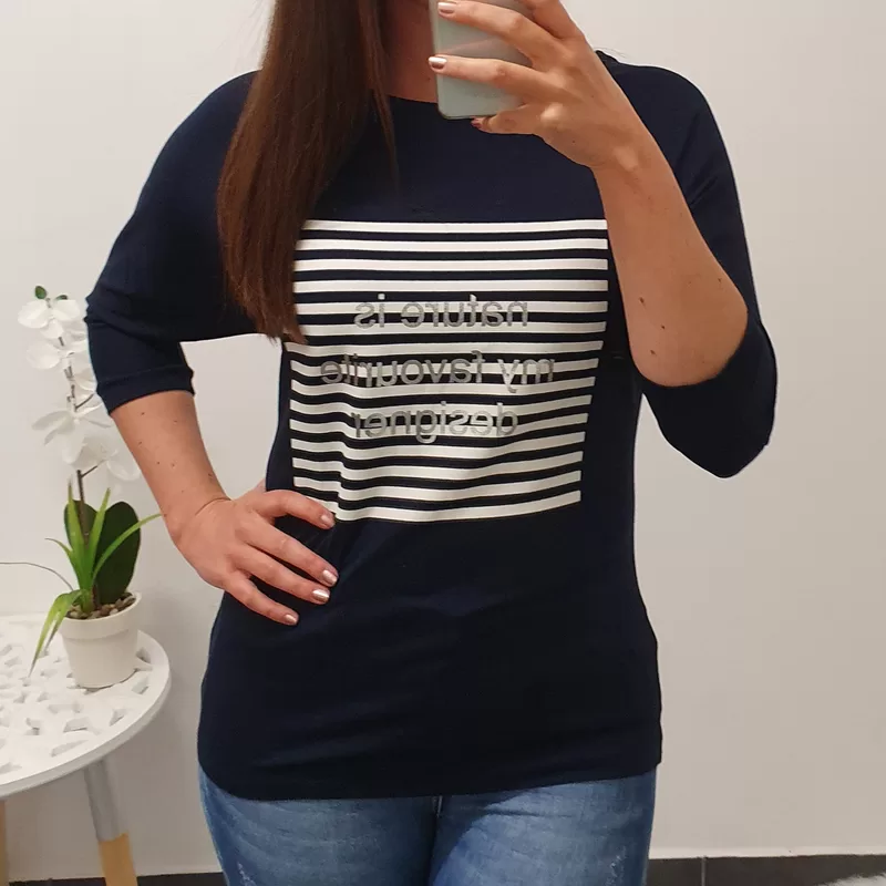 Majica Favorite s 3/4 rokavi. Majica je v temno modri barvi z belo – srebrnim tiskom. Kroj majice je na ‘metuljčka’.