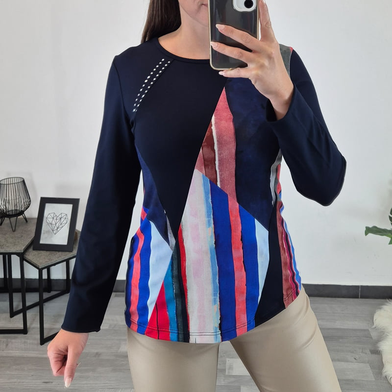 Ženska viskozna majica ima dolga rokava, na sprednji strani je narejena iz vzorčastega blaga, krasijo jo še kamenčki. Rokava in hrbtni del pa so narejeni iz enobarvnega blaga v modri barvi.