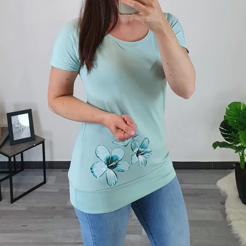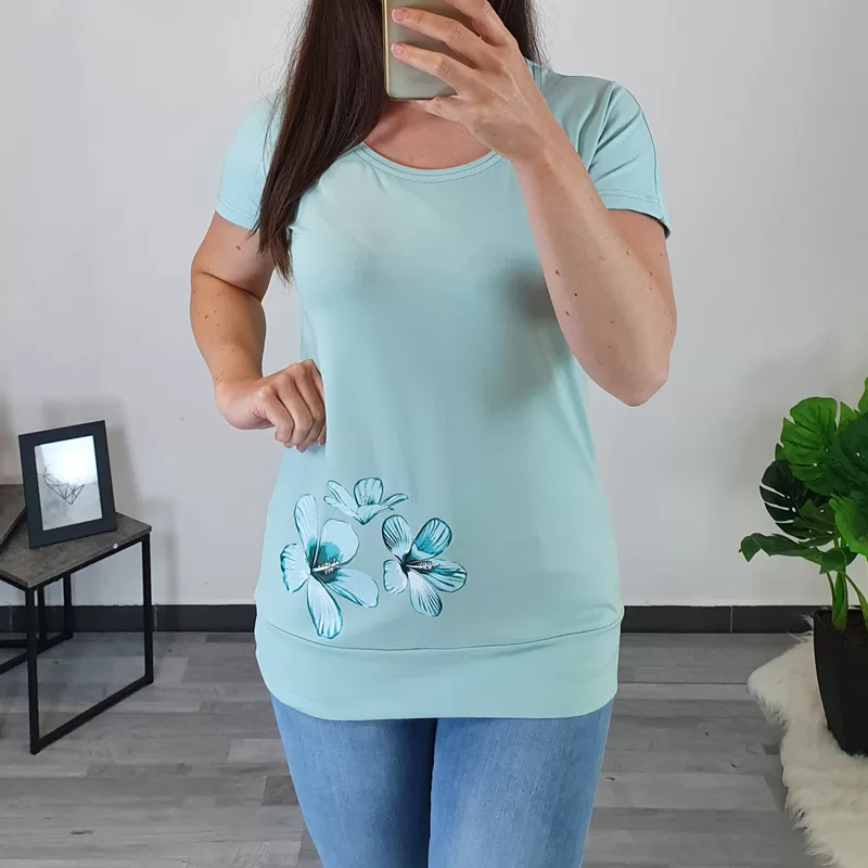 Modna ženska majica Janica v mint zeleni barvi. Majica ima kratka rokava in je širšega modela, ki se zaključuje s patentom. Na sprednji levi strani jo krasi tisk treh cvetic. Na voljo je od številke 36 do 50.