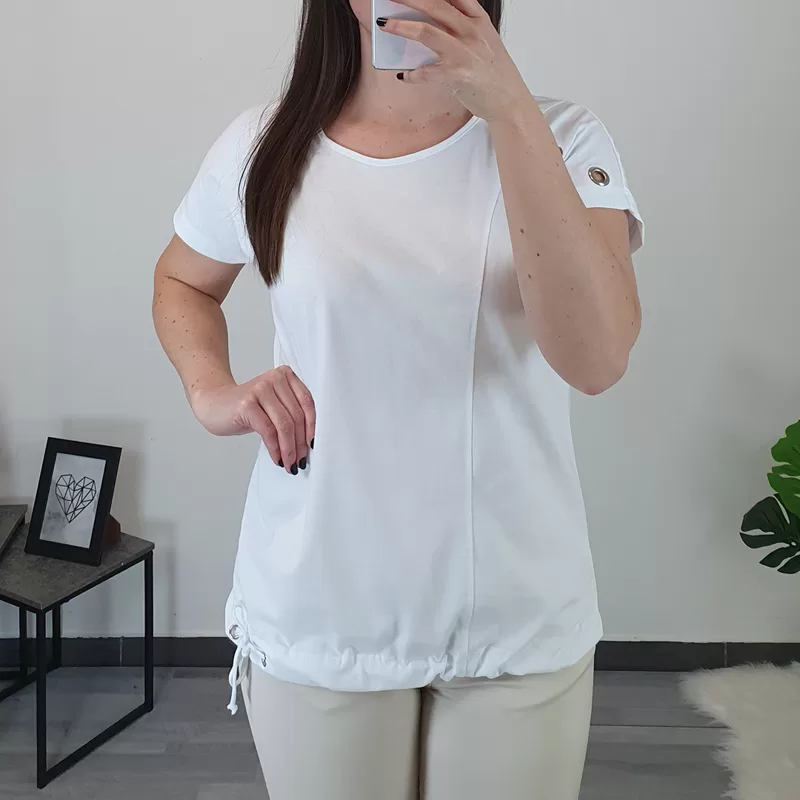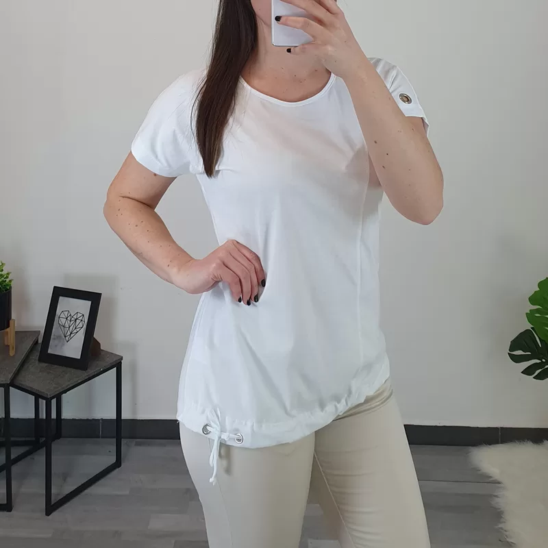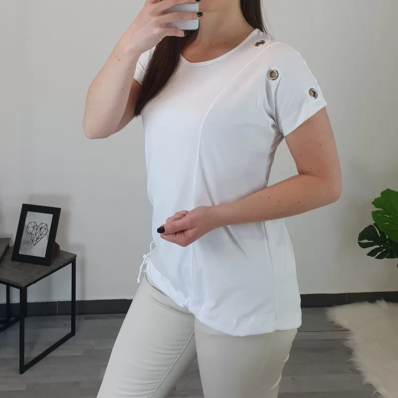 Ženska bombažna majica v beli barvi. Kroj majice je širok, na spodnjem delu je dodana vrvica s katero majico oblikujete. Majica ima kratka rokava, na desnem rokavu so dodani srebrni netki.