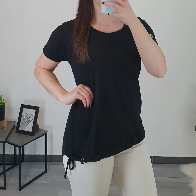 Ženska bombažna majica v črni barvi. Kroj majice je širok, na spodnjem delu je dodana vrvica s katero majico oblikujete. Majica ima kratka rokava, na desnem rokavu so dodani srebrni netki.