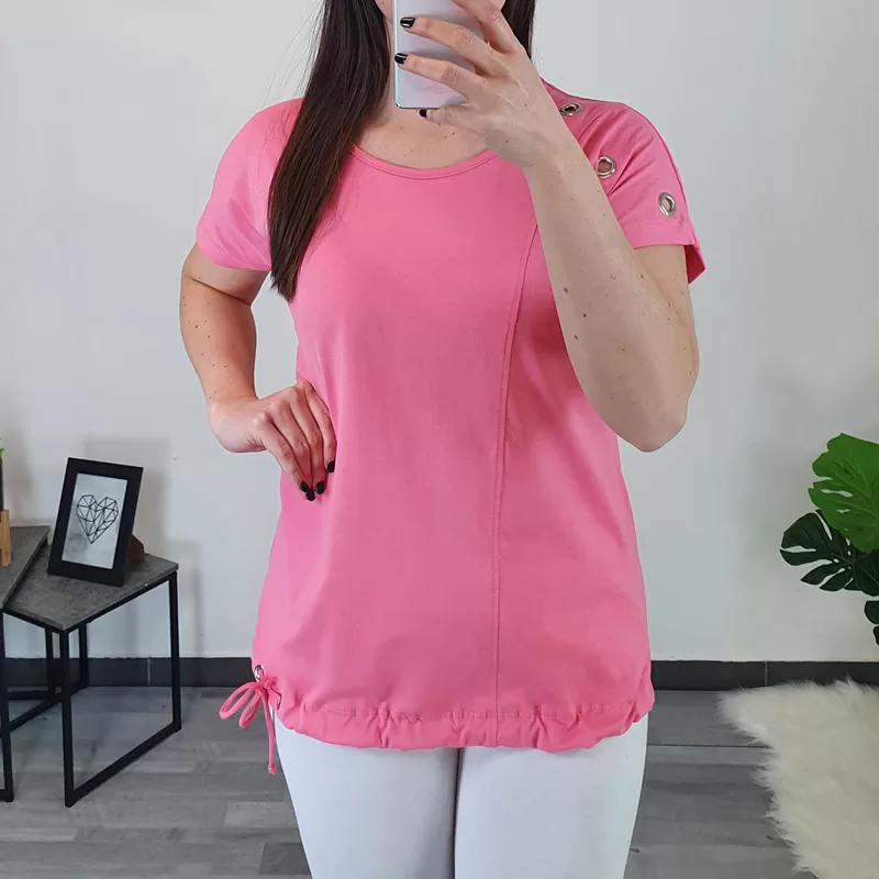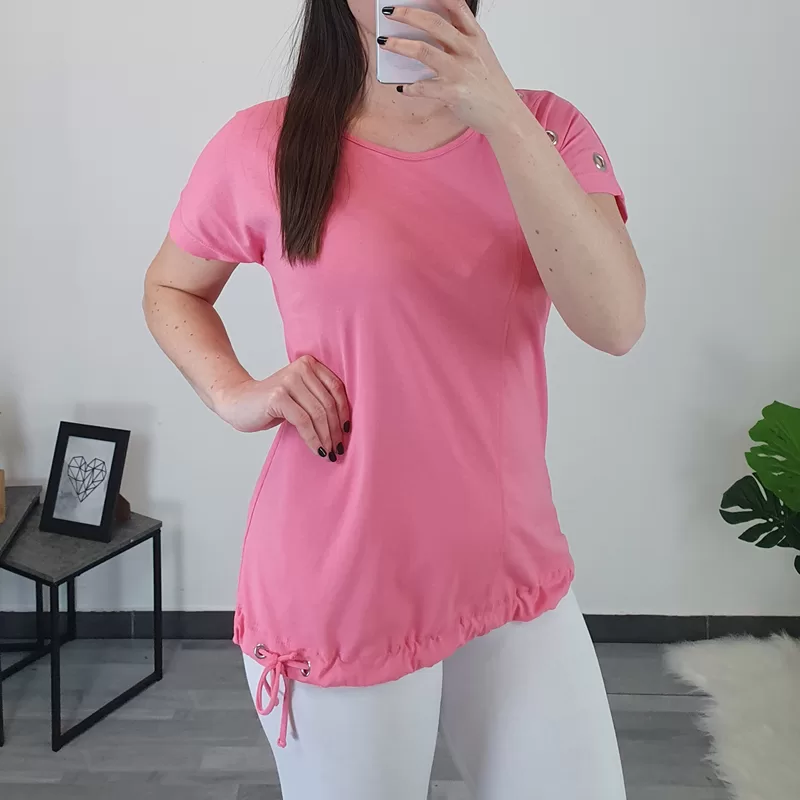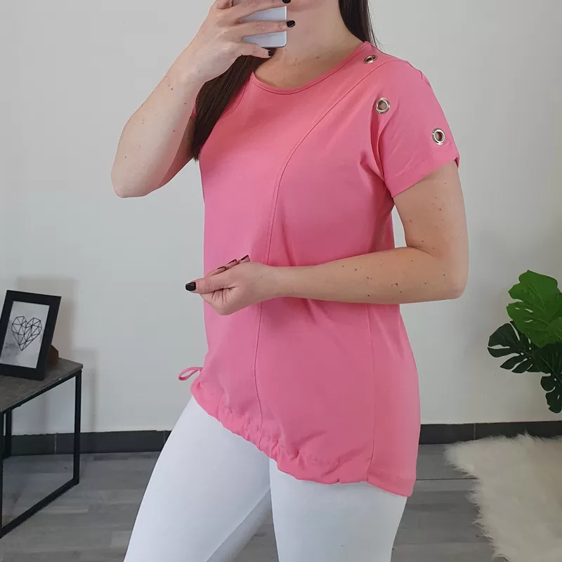 Ženska bombažna majica v roza barvi. Kroj majice je širok, na spodnjem delu je dodana vrvica s katero majico oblikujete. Majica ima kratka rokava, na desnem rokavu so dodani srebrni netki.