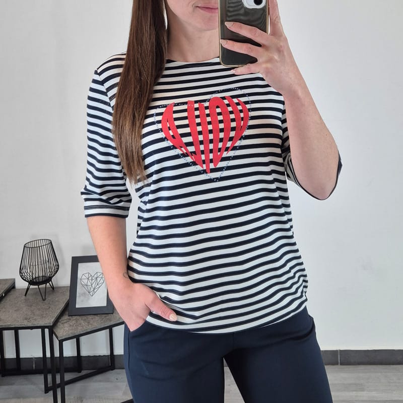 Ženska majica s kratkimi rokavi priznane blagovne znamke Kenny S. Majica ima bele in temno modre črte, na sprednji strani je dodan še tisk. Kroj majice je širši in lepo pade, na spodnjem delu je dodana elastika. Narejena je iz mešanice viskoze in je mehka na otip.