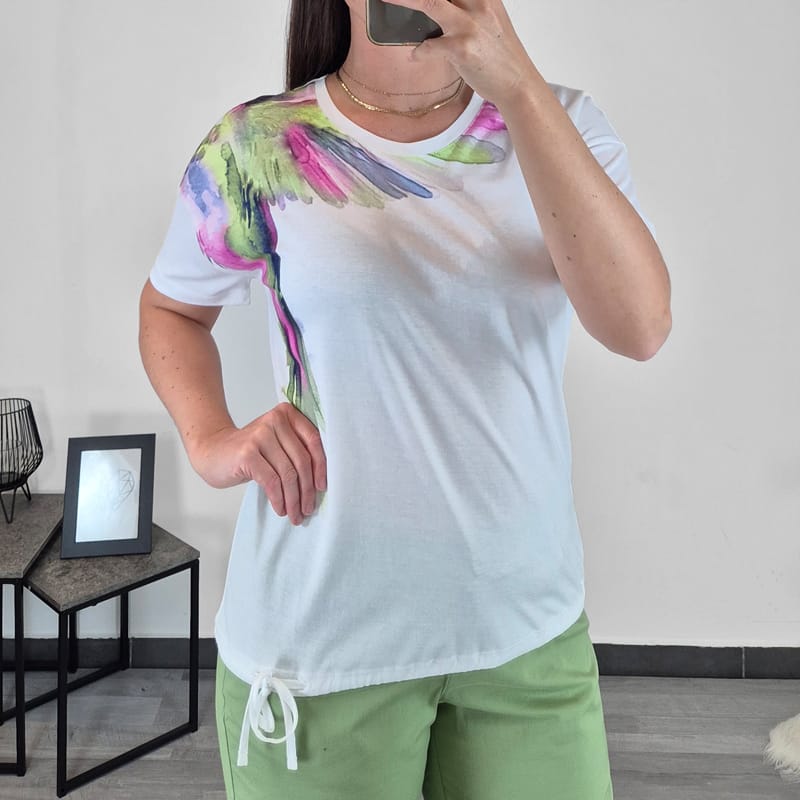 Ženska majica s kratkimi rokavi priznane blagovne znamke Kenny S. Majica je v osnovi bele barve, na zgornji sprednji strani jo krasi pisan vzorec. Kroj majice je širši in lepo pade. Na spodnjem delu je dodana vrvica s katero si nastavite širino. Narejena je iz mešanice bombaža in modala, zato je mehka na otip in prijetna za nošenje. Na voljo v velikosti od 36 do 46.