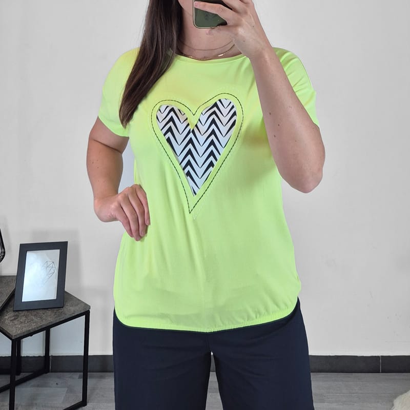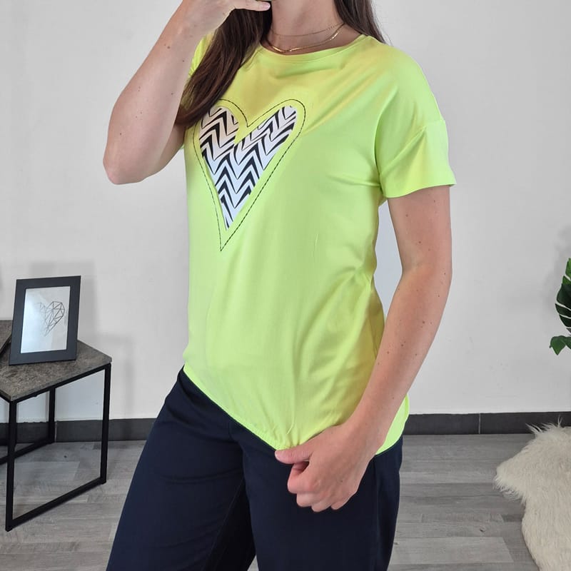 Ženska majica s kratkimi rokavi priznane blagovne znamke Kenny S. Majica je v zeleni barvi, na sprednji strani jo krasi srček v beli barvi. Kroj majice je širši in lepo pade. Na spodnjem delu je dodana elastika. Narejena je iz viskoze in je prijetna za nošenje. Na voljo v velikosti od 36 do 44.