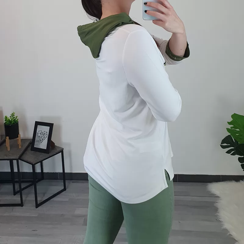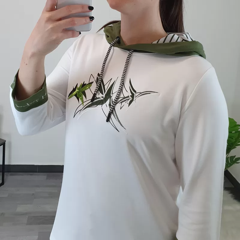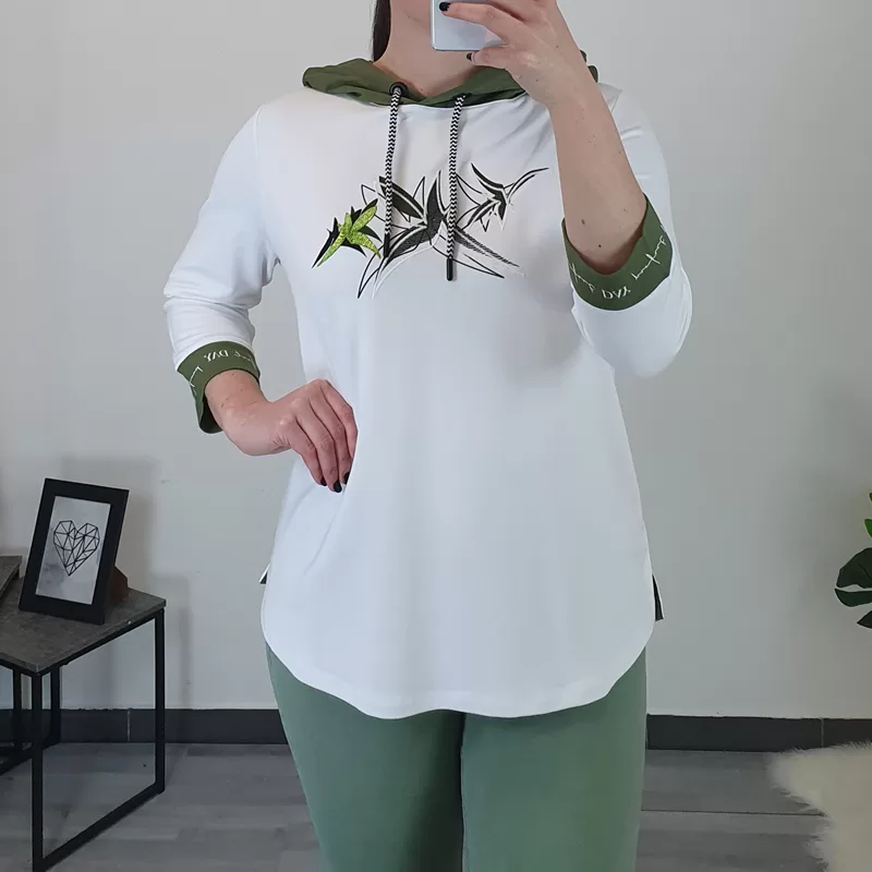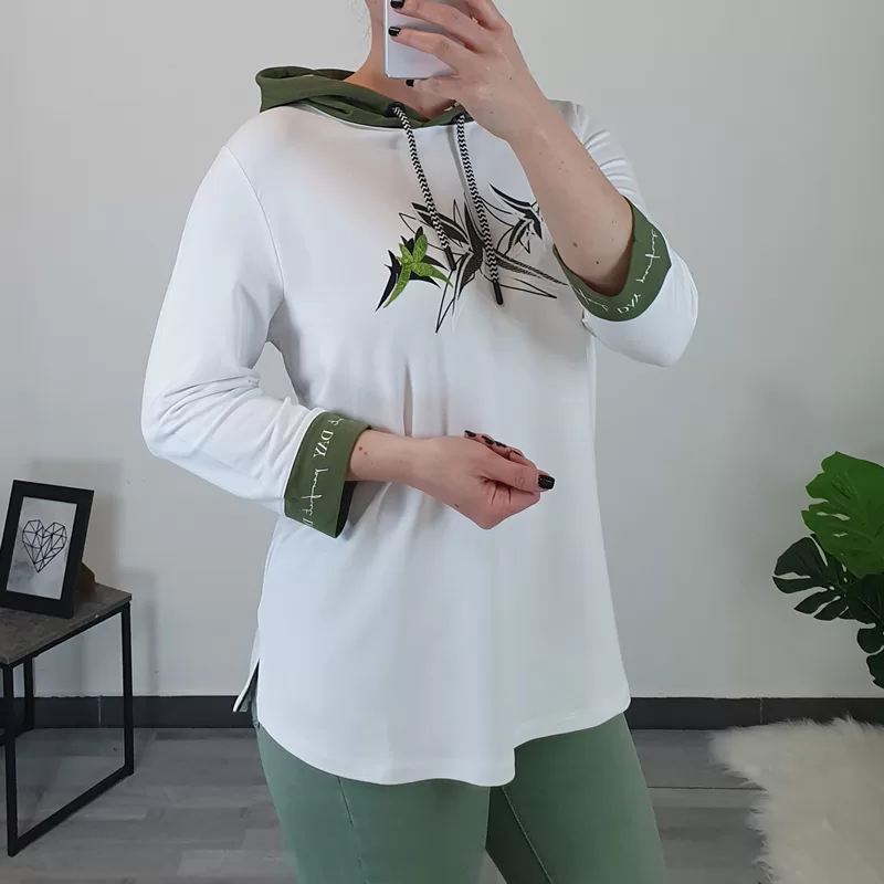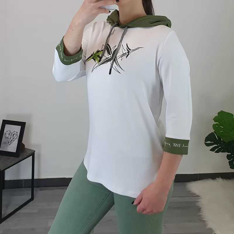 Ženska majica znamke Kenny S. v beli barvi. Majica je izdelana iz kvalitetne viskoze, je zračna in mehka na otip. Majica ima kapuco v olivno zeleni barvi, ter tisk in vezenje na sprednji strani. Majica ima 3/4 rokava, ki se zaključijo z olivno zelenim patentom. Na voljo je od številke 38 do 46.