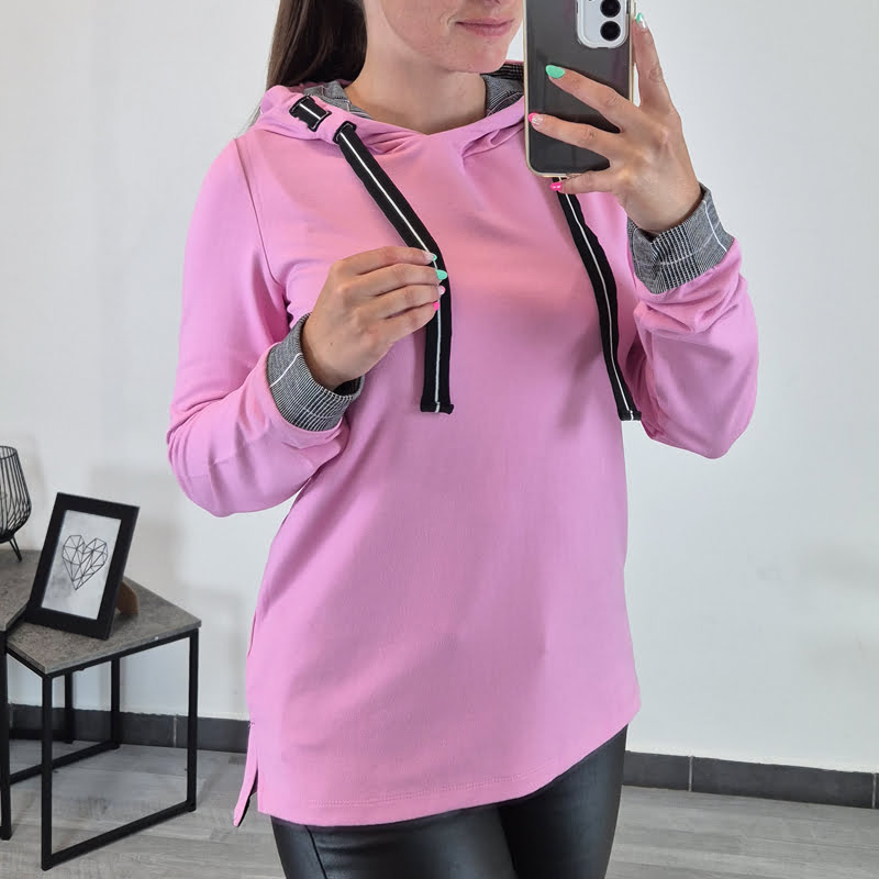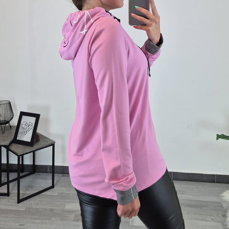 Ženska majica znamke Kenny S. v roza barvi. Majica je izdelana iz kvalitetne viskoze, je zračna in mehka na otip. Majica ima kapuco, na notranji strani je karirasta, na zunanji strani pa ima tisk. Majica ima dolga rokava, ki se zaključijo s karirastim patentom. Na voljo je od številke 34 do 44.