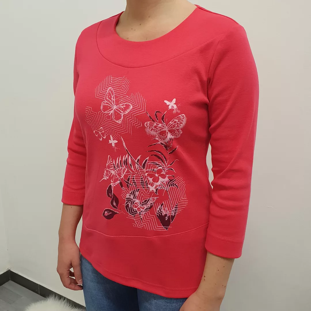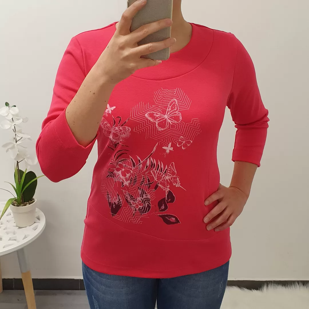 Bombažna majica Korina v roza barvi, s tiskom. Majica ima 3/4 rokav.