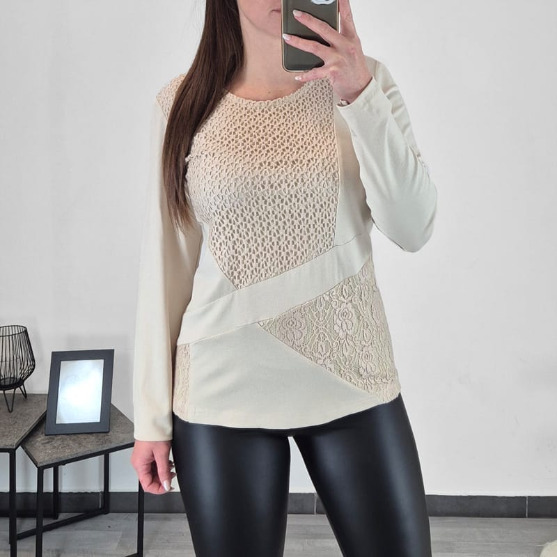 Ženska elegantna majica Kristi v bež barvi. Na sprednji strani jo krasi bež čipka. Majica ima dolga rokava in je rahlo oprijetega kroja. Izdelana je iz kvalitetne mešanice viskoze in poliestra. Na voljo je od številke 42 do 50.