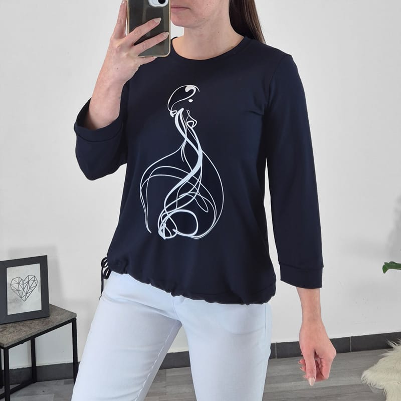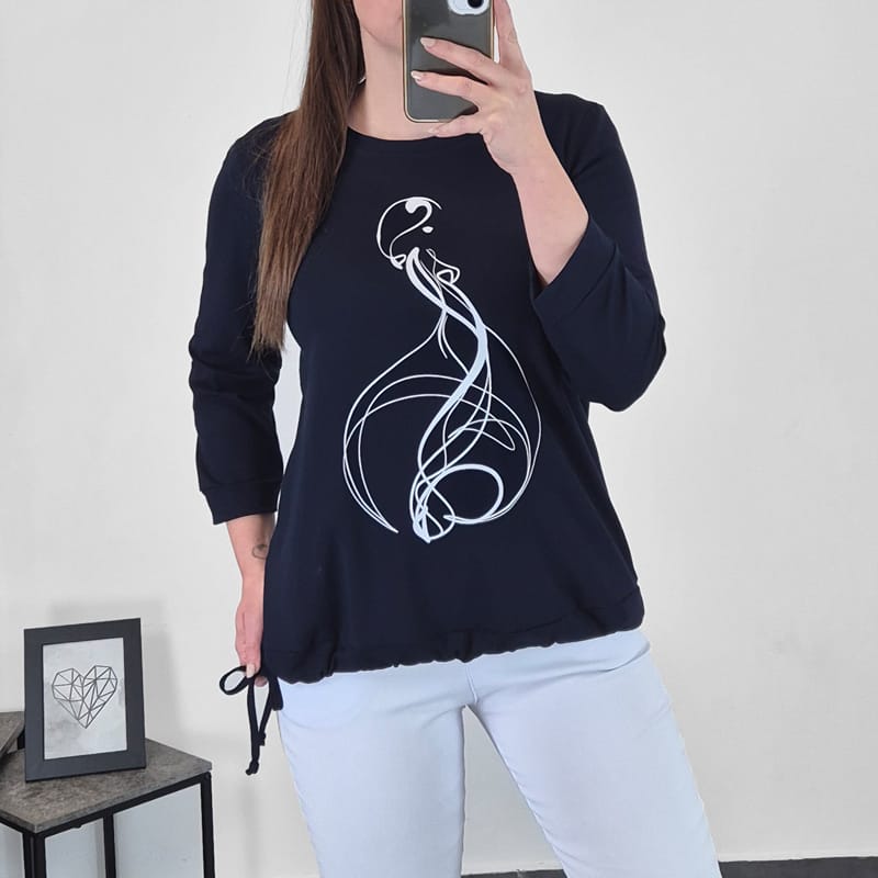 Ženska majica Lia v temno modri barvi. Majica ima na sprednji strani tisk, na spodnjem delu je všita vrvica, s katero lahko majico oblikujete po telesu. Dolžina rokavov je 7/8. Izdelana je iz kvalitetne mešanice viskoze in elastana. Na voljo je od številke 38 do 52.