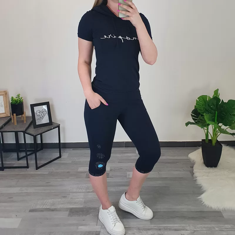 Ženska majica Mija s kratkimi rokavi. Majica je v temno modri barvi z belim napisom ‘inspire’. Majica ima kapuco s temno modrim trakom, na spodnjem delu majice je dodan patent.