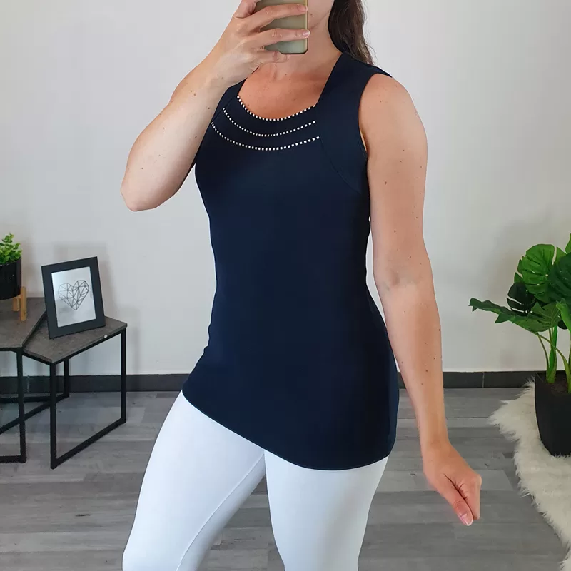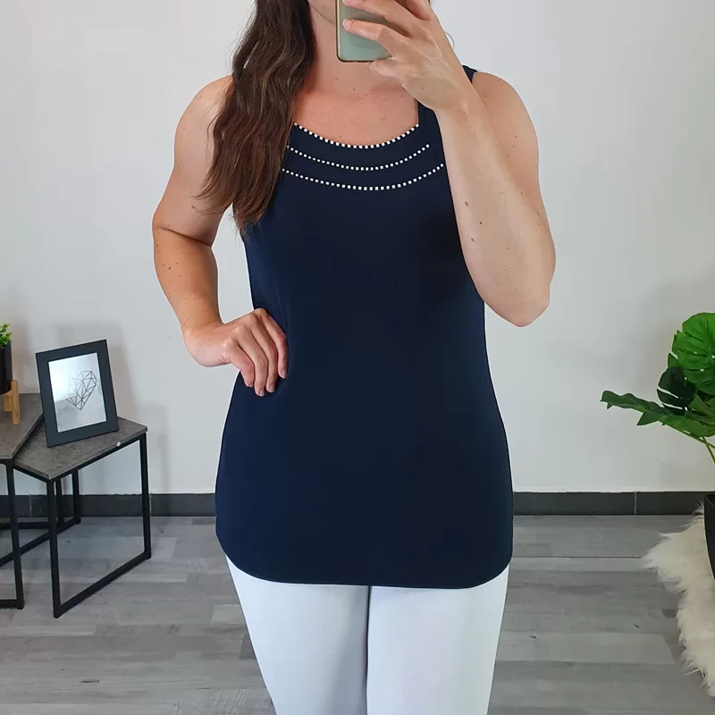 Poletna bombažna majica Mojca v temno modri barvi. Majica je brez rokav in oprijetega modela. Naramnice so široke, na sprednji strani jo krasijo trije ozki trakovi v kombinaciji temno modre in bele barve. Majica je odlična kombinacija k vašim najljubšim oblačilom in je primerna za vroče poletne dni. Izdelana je iz kvalitetnega bombaža in je zelo prijetna za nošenje. Na voljo je od številke 38 do 52.