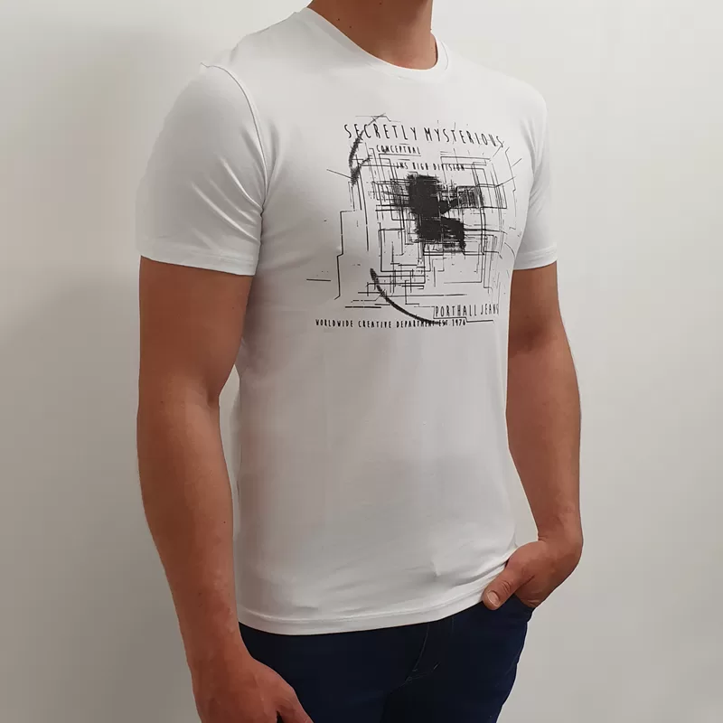 Moška majica Mysterious s kratkimi rokavi. Majica je v beli barvi, s tiskom v črni.