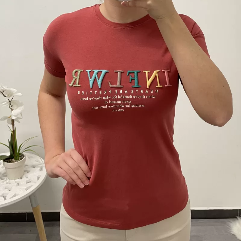 Modna bombažna majica v opečnati barvi. Majica je izdelana iz kvalitetne mešanice bombaža in elastana ter je zelo prijetna za nošenje. Majica ima kratka rokava, na sprednji strani jo krasi pisan všit napis in beli tisk.