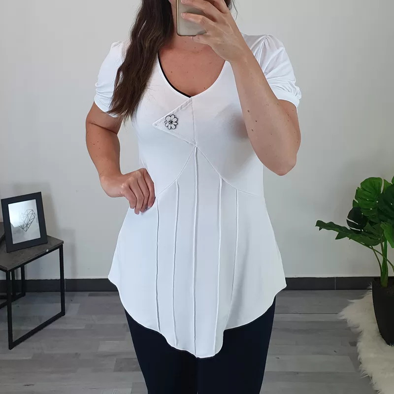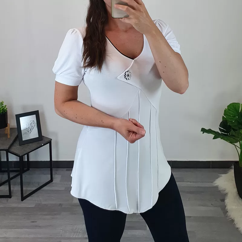 Modna asimetrična majica Nasi v beli barvi. Majica je v predelu prsi oprijeta, nato pa je krojena navzven. Na sprednji strani jo krasi gumb v beli barvi in dekorativni šivi, ki majici dajejo posebno zanimiv izgled. Rokava so rahlo nabrana in se zaključujejo z robom. Izdelana je iz kvalitetne viskoze in je prijetna za nošenje. Na voljo je od številke 38 do številke 46.
