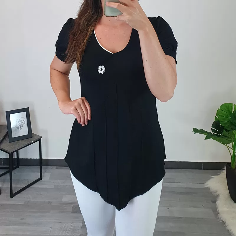 Modna asimetrična majica Nasi v črni barvi. Majica je v predelu prsi oprijeta, nato pa je krojena navzven. Na sprednji strani jo krasi gumb v beli barvi in dekorativni šivi, ki majici dajejo posebno zanimiv izgled. Rokava so rahlo nabrana in se zaključujejo z robom. Izdelana je iz kvalitetne viskoze in je prijetna za nošenje. Na voljo je od številke 38 do številke 46.