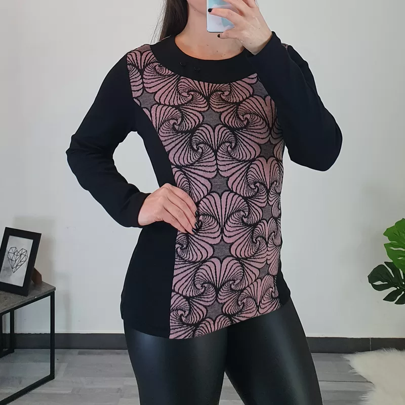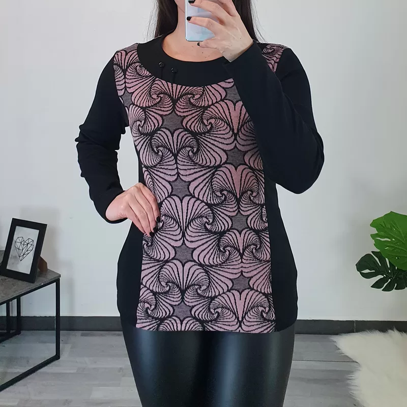 Ženska majica Nesaja v črni barvi. Majica ima dolga rokava in je rahlo oprijetega modela, na sprednji in zadnji strani je kombinirana z vzorčastim blagom v črno-roza kombinaciji. Ovratnik je klasičen, krasita ga dva gumba. Majica je izdelana iz bolj toplega 100% bombaža in je primerna za hladne dni. Na voljo je od številke 42 do 48.