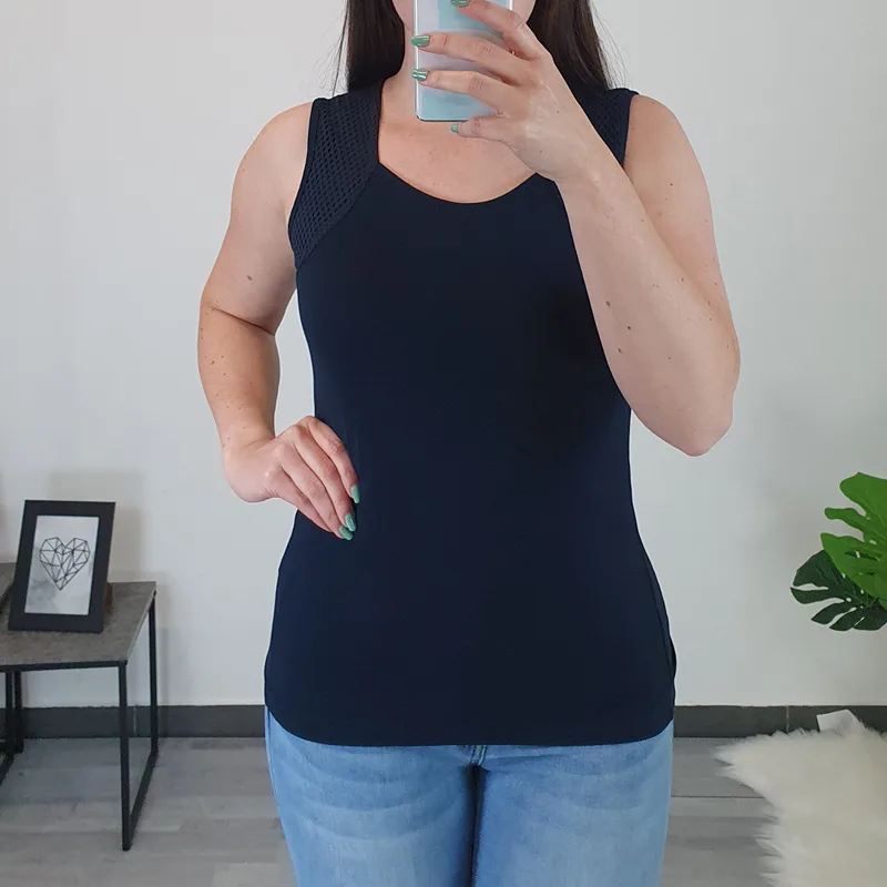 Ženska bombažna majica Rezika v temno modri barvi. Majica je brez rokav, na sprednji strani je dodana temno modra mreža. Izdelana je iz kvalitetne mešanice bombaža in elastana. Na voljo je od številke 38 do 50.
