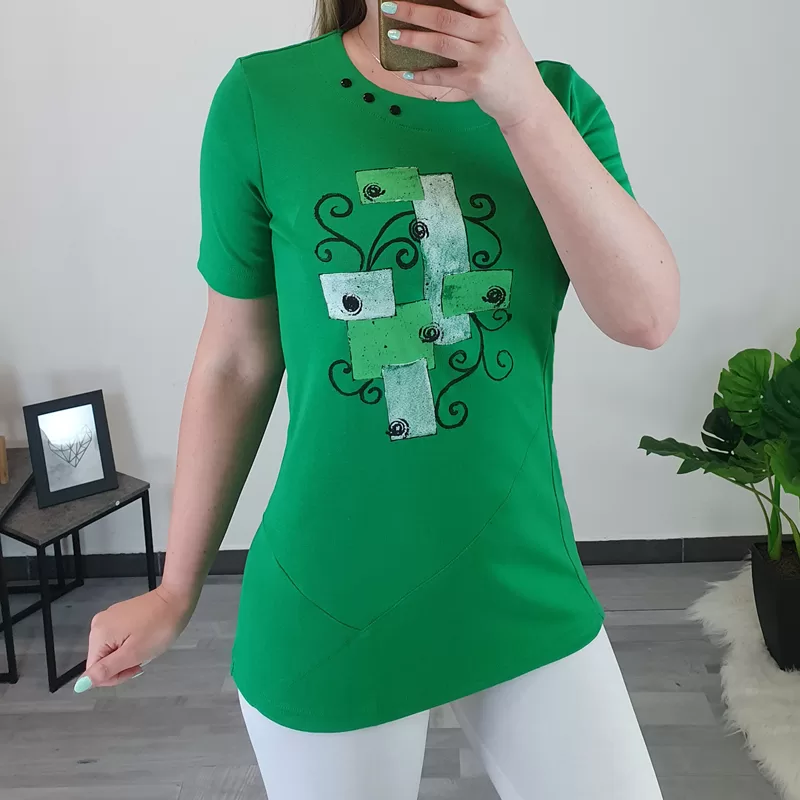 Ženska majica Sabel s kratkimi rokavi. Majica je v zeleni barvi, na levi strani ob vratu ima dodane tri črne dekorativne gumbe, pod gumbi pa jo krasi tisk. Majica je narejena iz kvalitetnega bombaža. Krojena je od velikosti 40 do 52.