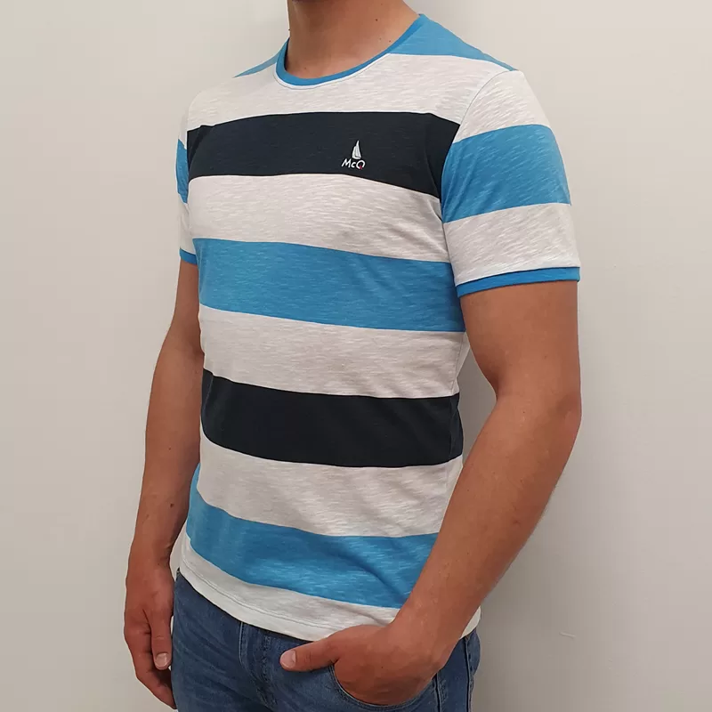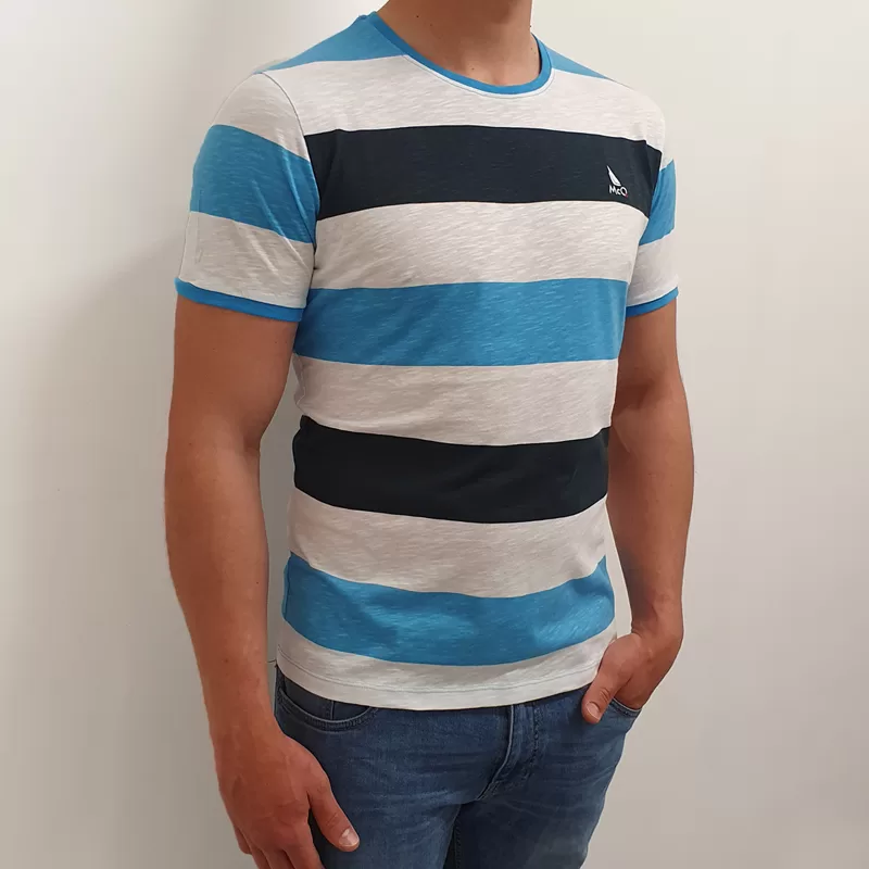 Moška majica Sail s kratkimi rokavi. Majica je s črtastim vzorcem, v kombinaciji bele, modre in temno modre barve.