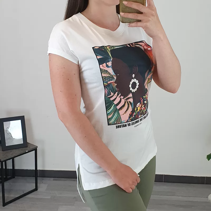 Modna bombažna majica v beli barvi. Majica ima kratka rokava, na zadnjem delu je podaljšana. Na sprednji strani jo krasi tisk ženskega obraza in napis. Izdelana je iz 100% bombaža, je lahka in zračna. Na voljo je od številke XS do XL.