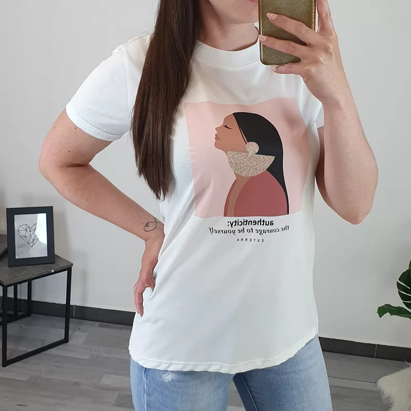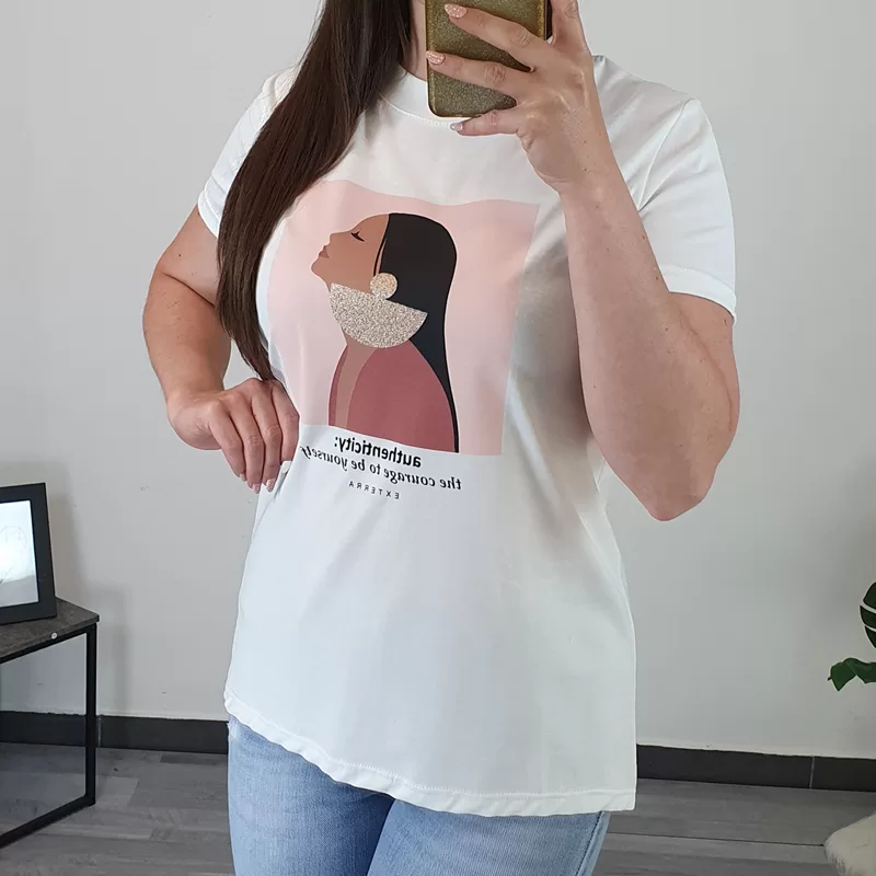 Modna bombažna majica v beli barvi. Majica ima kratka rokava, na zadnjem delu je podaljšana. Na sprednji strani jo krasi tisk ženskega obraza in napis. Izdelana je iz 100% bombaža, je lahka in zračna. Na voljo je od številke XS do XL.