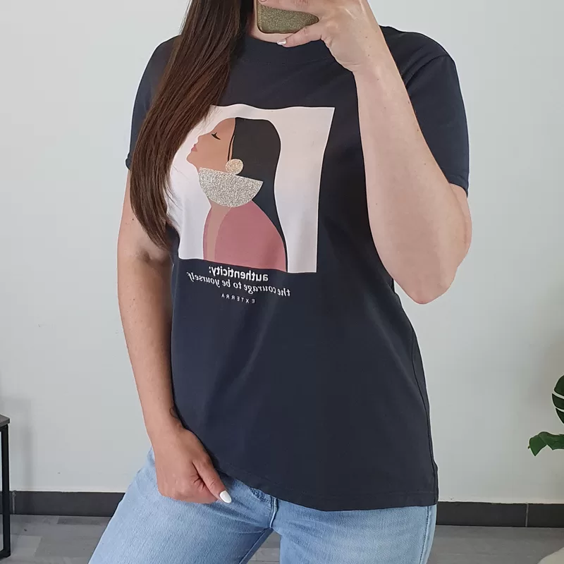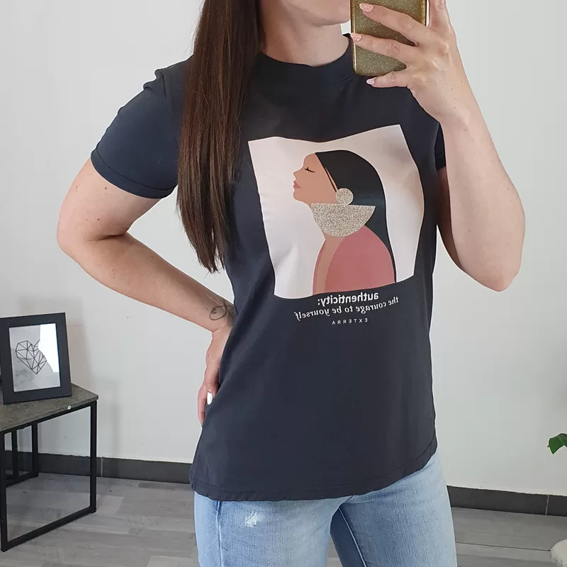 Modna bombažna majica v temno sivi barvi. Majica ima kratka rokava, na zadnjem delu je podaljšana. Na sprednji strani jo krasi tisk ženskega obraza in napis. Izdelana je iz 100% bombaža, je lahka in zračna. Na voljo je od številke XS do XL.