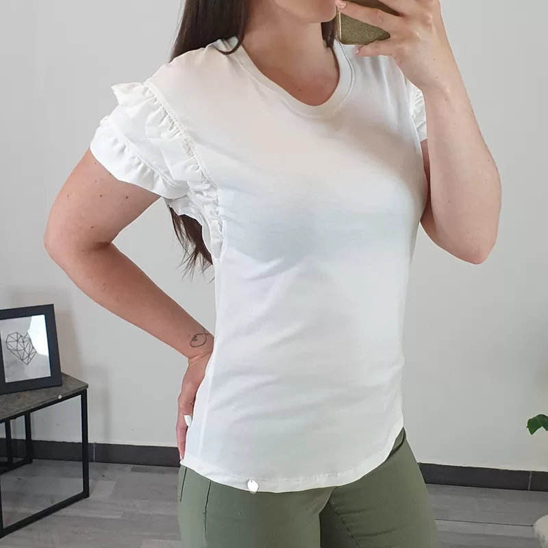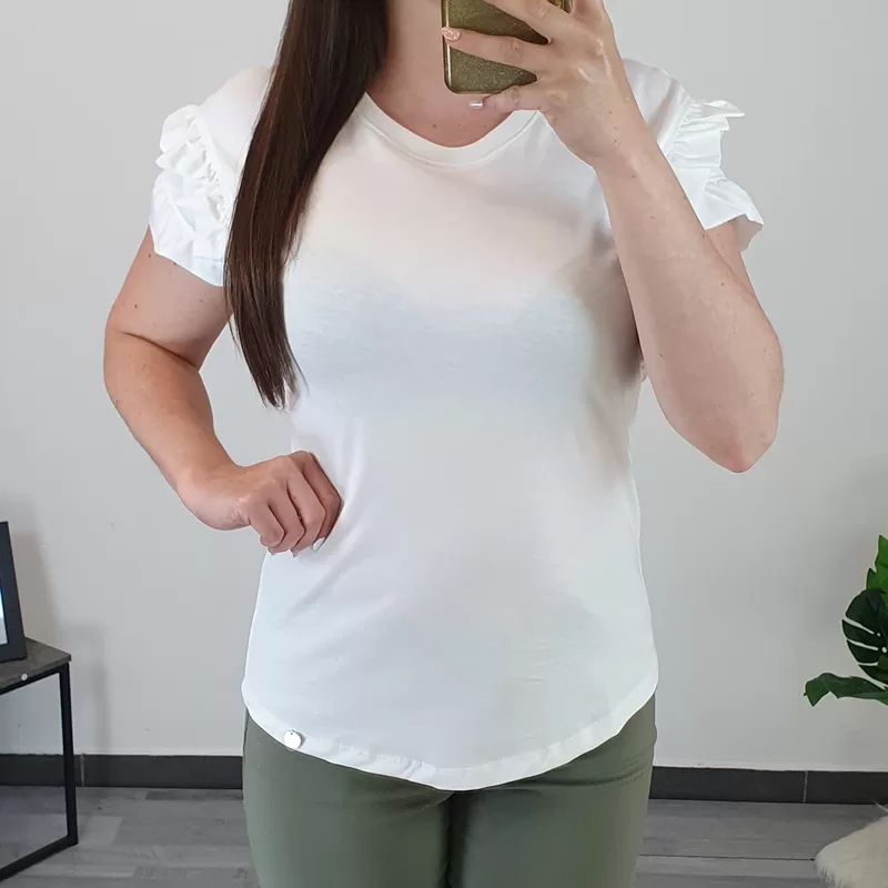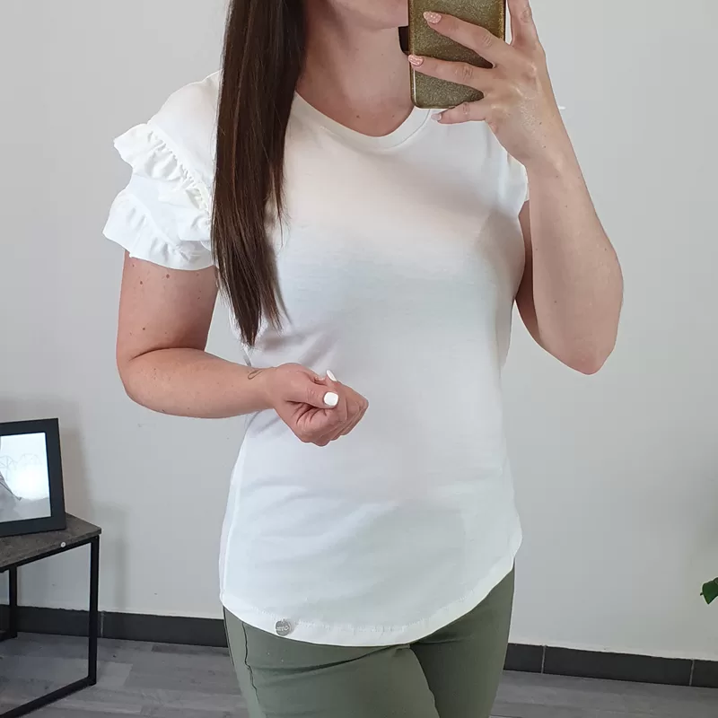 Modna bombažna majica v beli barvi. Majica ima kratka rokava in je oprijetega modela. Na rokavih so dodani volančki, kar ji daje posebno zanimiv izgled. Izdelana je iz kvalitetnega bombaža in je prijetna za nošenje. Na voljo je od številke XS do XL.