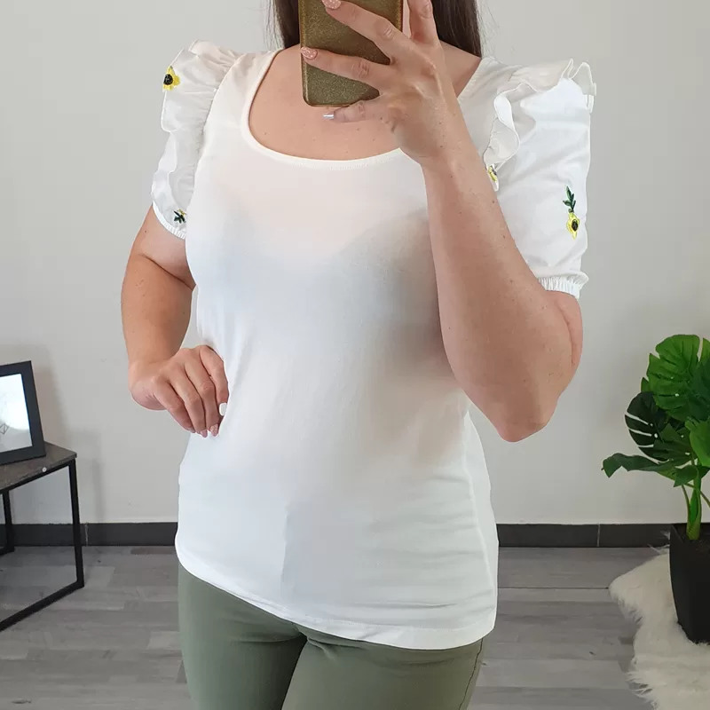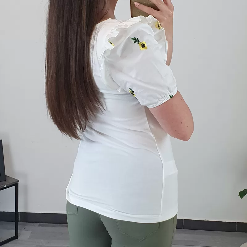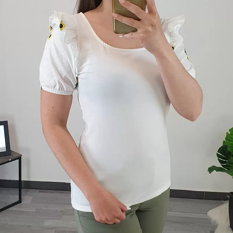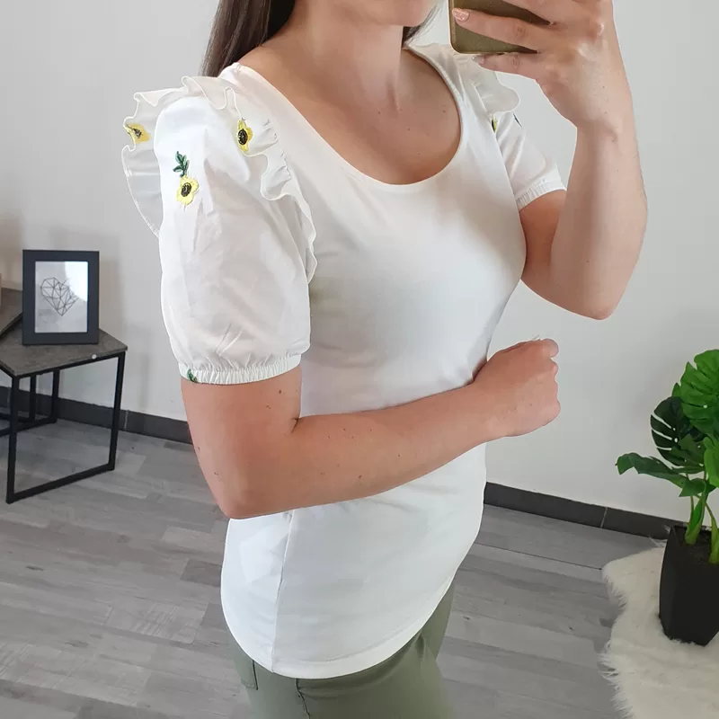 Modna ženska majica v beli barvi. Majica ima kratka rokava in je oprijetega modela. Na rokavih so dodani volančki in vezene cvetice. Izdelana je iz kvalitetne mešanice bombaža in elastana ter je prijetna za nošenje. Na voljo je od številke XS do XL.