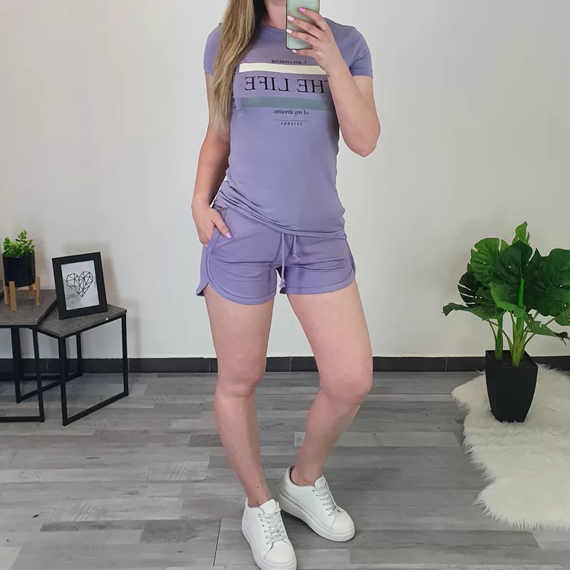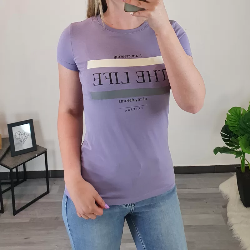 Modna bombažna majica v vijolični barvi. Majica ima kratka rokava in je rahlo oprijetega modela. Izdelana je iz kvalitetnega bombaža in je prijetna za nošenje. Na sprednji strani jo krasi tisk. Na voljo je od številke XS do XL.