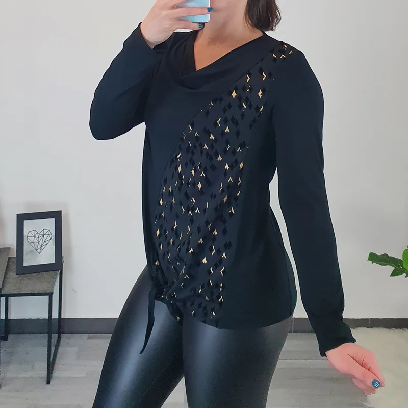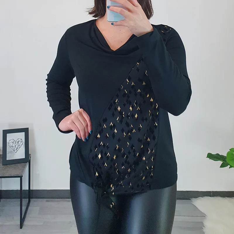 Modna majica Staja v črni barvi. Na sprednji strani je kombinirana z blagom z zlatim vzorcem. Majica ima dolga rokava in je širšega modela, na sprednji strani se zaveže. Izdelana je iz kvalitetne viskoze in je prijetna za nošenje.