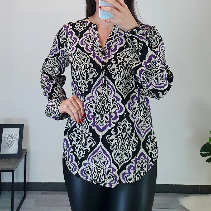 Modna majica Vernia v kombinaciji črne, bež in vijolične barve. Majica ima dolga rokava ki se zaključijo s patentom. Ima okrogel ovratnik z izrezom na V, dodani so še trije gumbi. Je širšega modela, izdelana iz 100% viskoze in lepo pade.