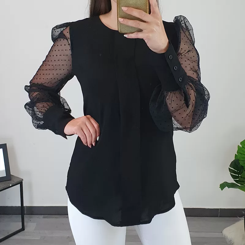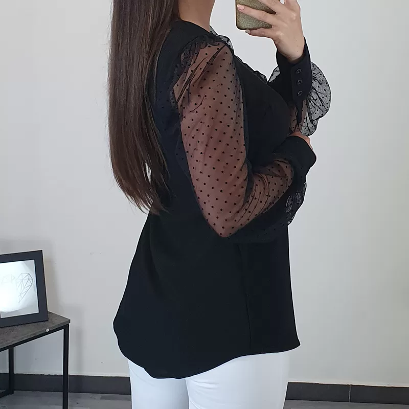 Elegantna ženska majica v črni barvi. Majica ima dolga prosojna rokava s črnimi pikicami, model je širši in lepo pada. Izdelana je iz kvalitetne viskoze, ki je lahek in zračen material. Na voljo je od številke XS do XL.