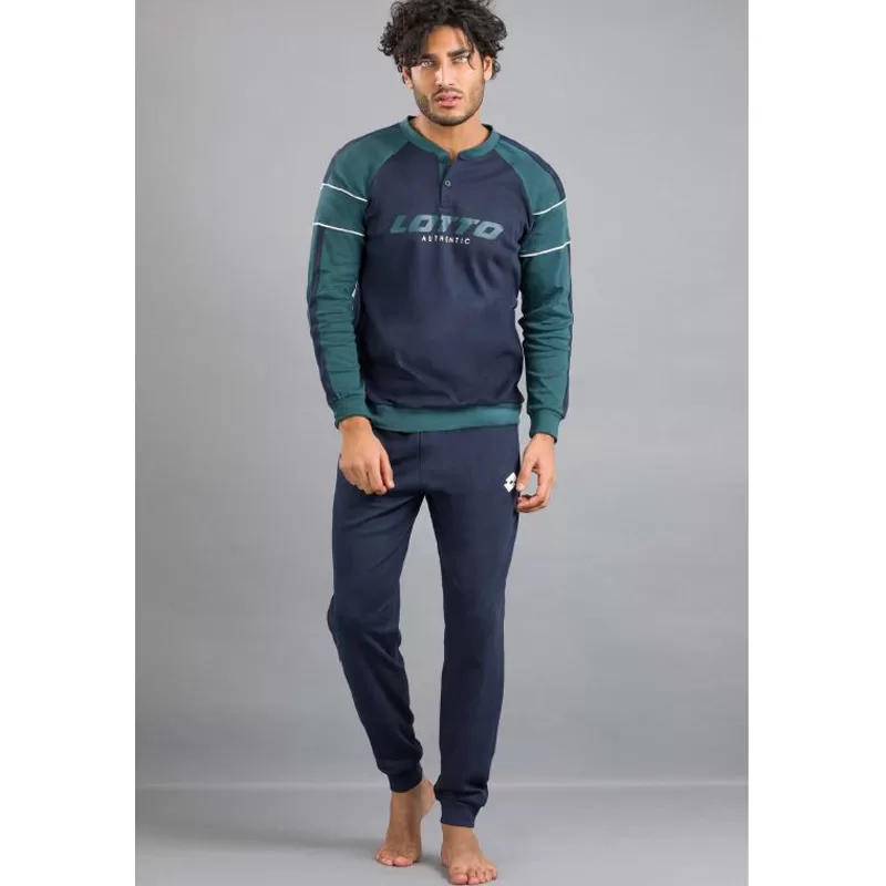 Moška pižama z dolgimi rokavi in z dolgimi hlačami. Spodnji del pižame je v temno modri barvi in ima patent. Zgornji del pižame je v kombinaciji temno modre in zelene in se zapenja na dva gumba. Rokava so zaključena s patentom.