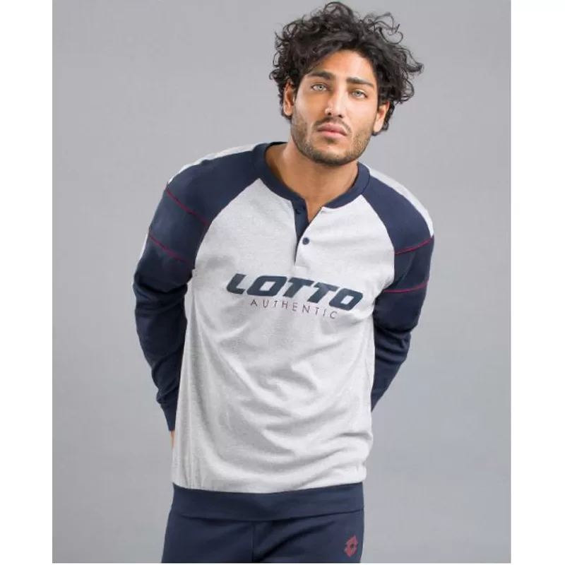 Moška pižama z dolgimi rokavi in z dolgimi hlačami. Spodnji del pižame je v temno modri barvi in ima patent. Zgornji del pižame je v kombinaciji temno modre in sive in se zapenja na dva gumba. Rokava so zaključena s patentom.