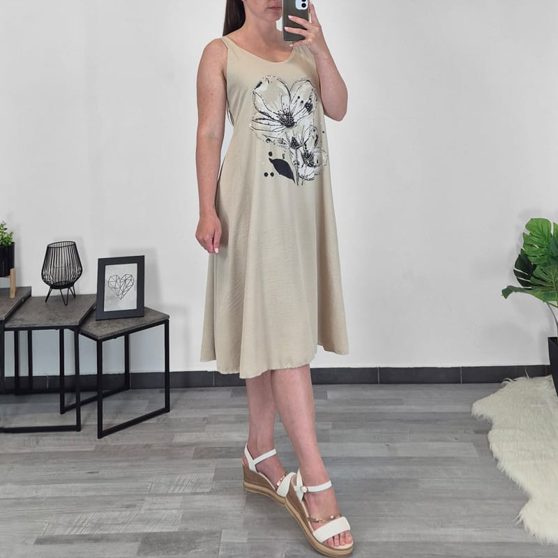 Ženska poletna obleka je izdelana iz mešanice viskoze in je prijetna za nošenje. Obleka je brez rokavov, spredaj ima tisk rože z bleščicami. Zadnji del na hrbtu je krojen naravnost in ima elastiko. Velikost je univerzalna, primerna za M do XL.