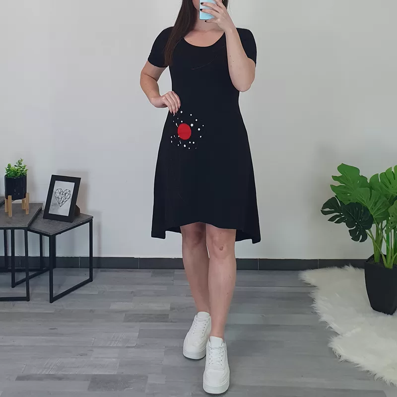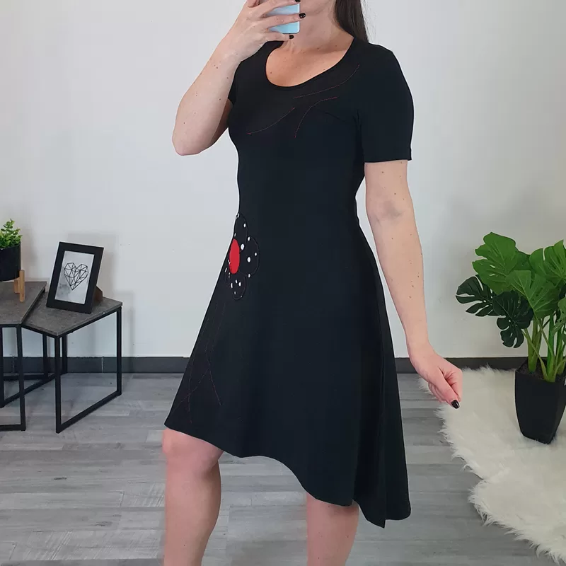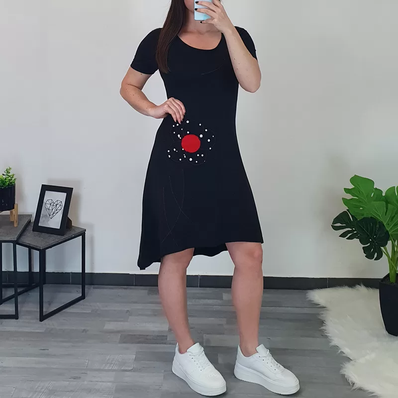 Ženska poletna obleka Anica je narejena iz tanjšega bombaža, ki diha in je primerna za tople dni. Obleka je v črni barvi, na sprednji strani ima prišit cvet, ki je sestavljen iz rdečega blaga. Obleka ima kratka rokava, na sprednji strani je krajša, na zadnji pa daljša.