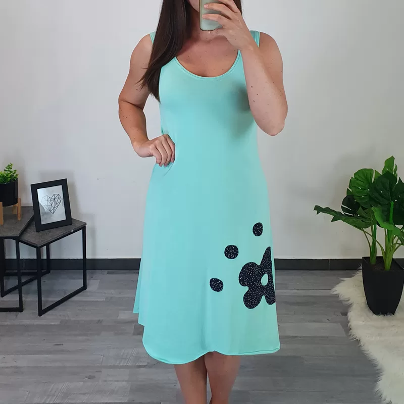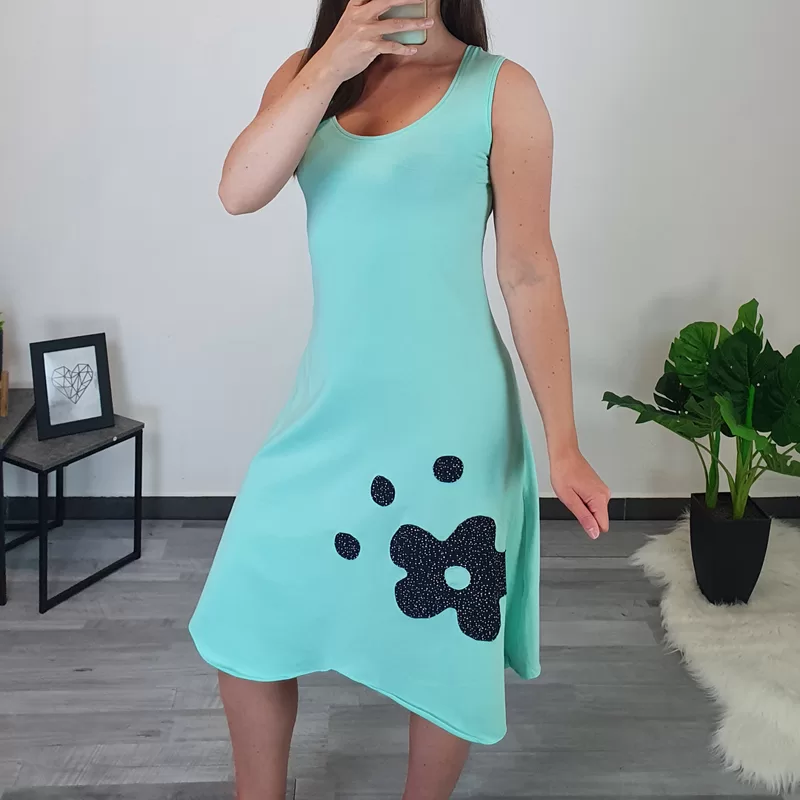 Modna bombažna obleka Anka v mint zeleni barvi. Obleka je brez rokav, naramnice so širše. V predelu prsi je oprijeta, nato pa krojenja rahlo navzven. Na sprednji strani jo krasi cvetlični našitek temno modri barvi. Na voljo je od številke 36 do 44.