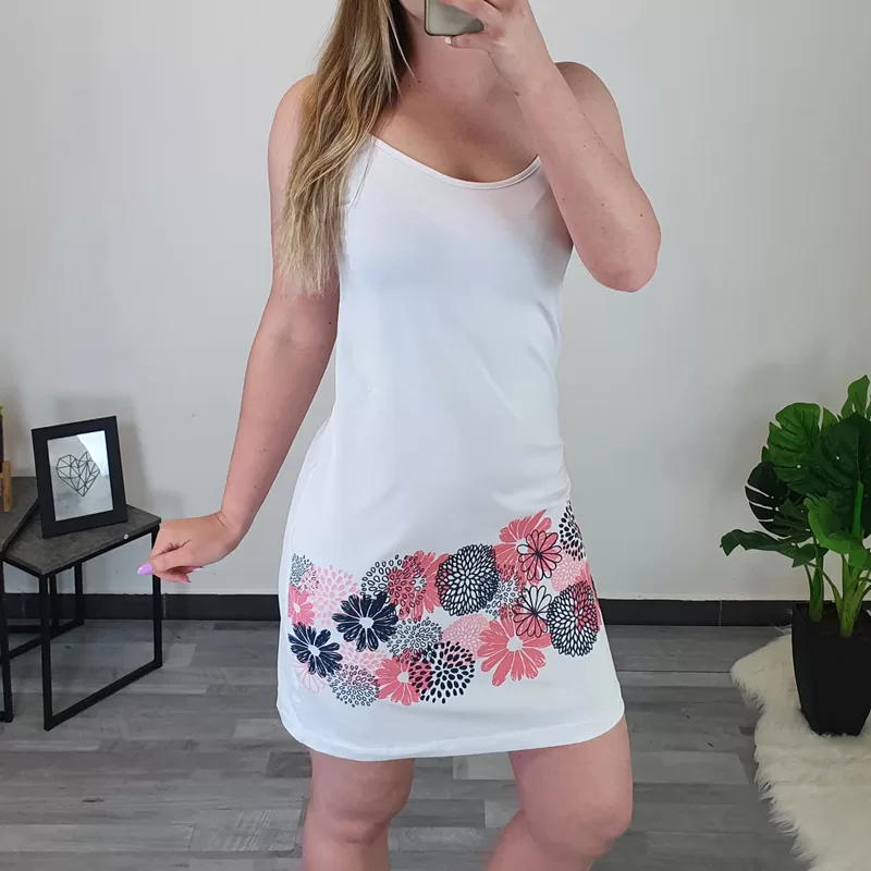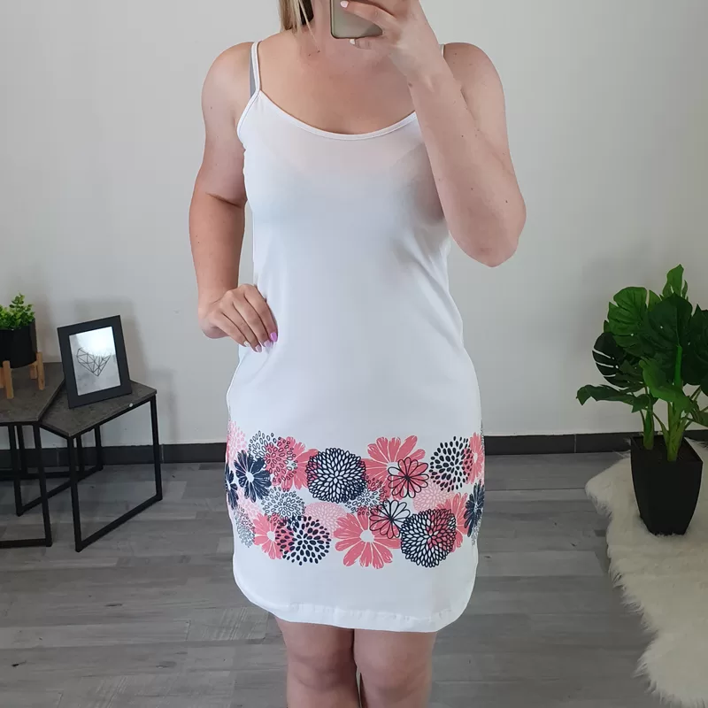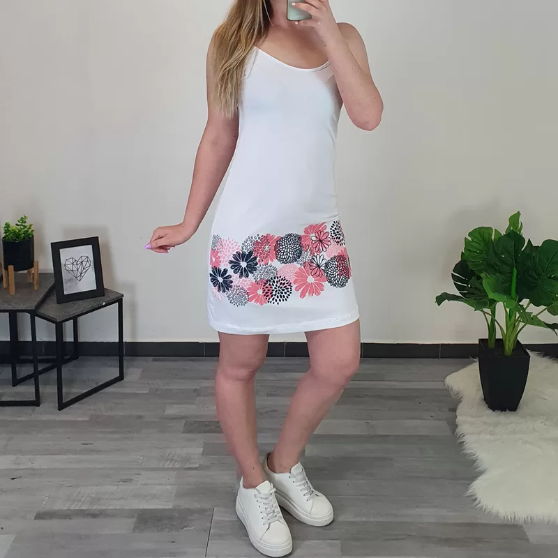 Modna bombažna obleka Biba v beli barvi. Obleka je izdelana iz kvalitetne mešanice bombaža in elastana ter je zelo prijetna za nošenje. Na sprednji strani jo krasi tisk cvetic v roza in temno modri. Obleka je brez rokav in sega do kolen. Izdelana je od številke 36 do 46.