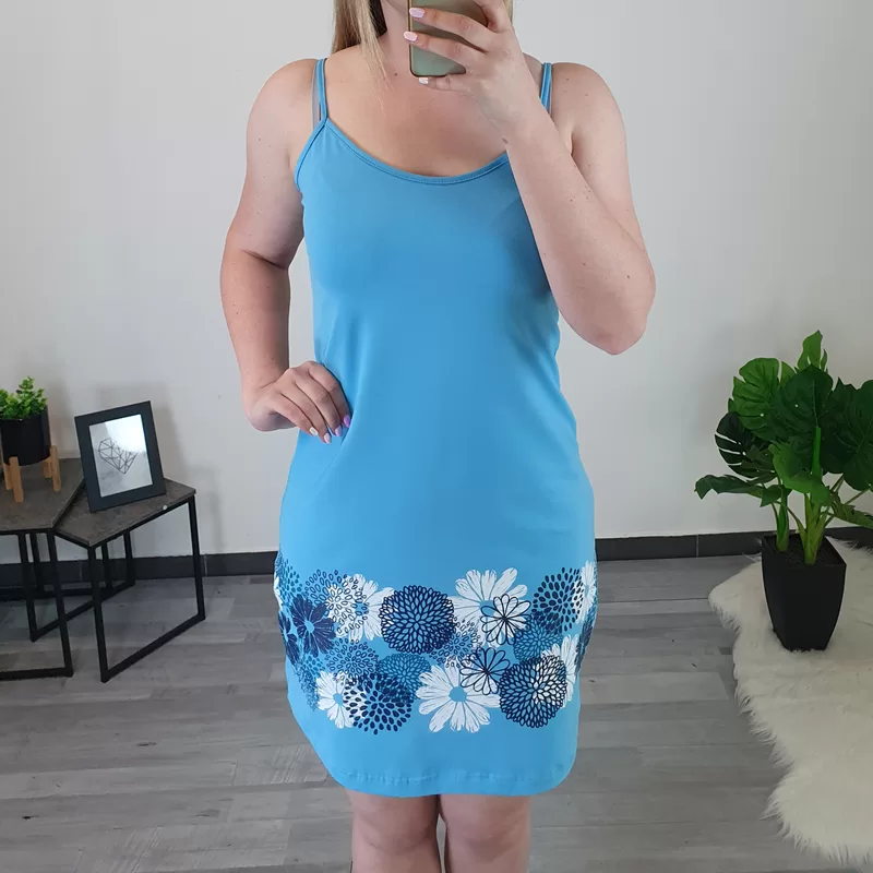 Modna bombažna obleka Biba v modri barvi. Obleka je izdelana iz kvalitetne mešanice bombaža in elastana ter je zelo prijetna za nošenje. Na sprednji strani jo krasi tisk cvetic v beli in temno modri. Obleka je brez rokav in sega do kolen. Izdelana je od številke 36 do 46.